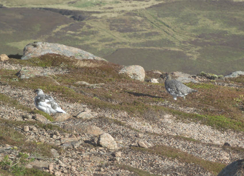 A pair of Ptarmigans on Ben Rinnes, with the female to the left and male to the right